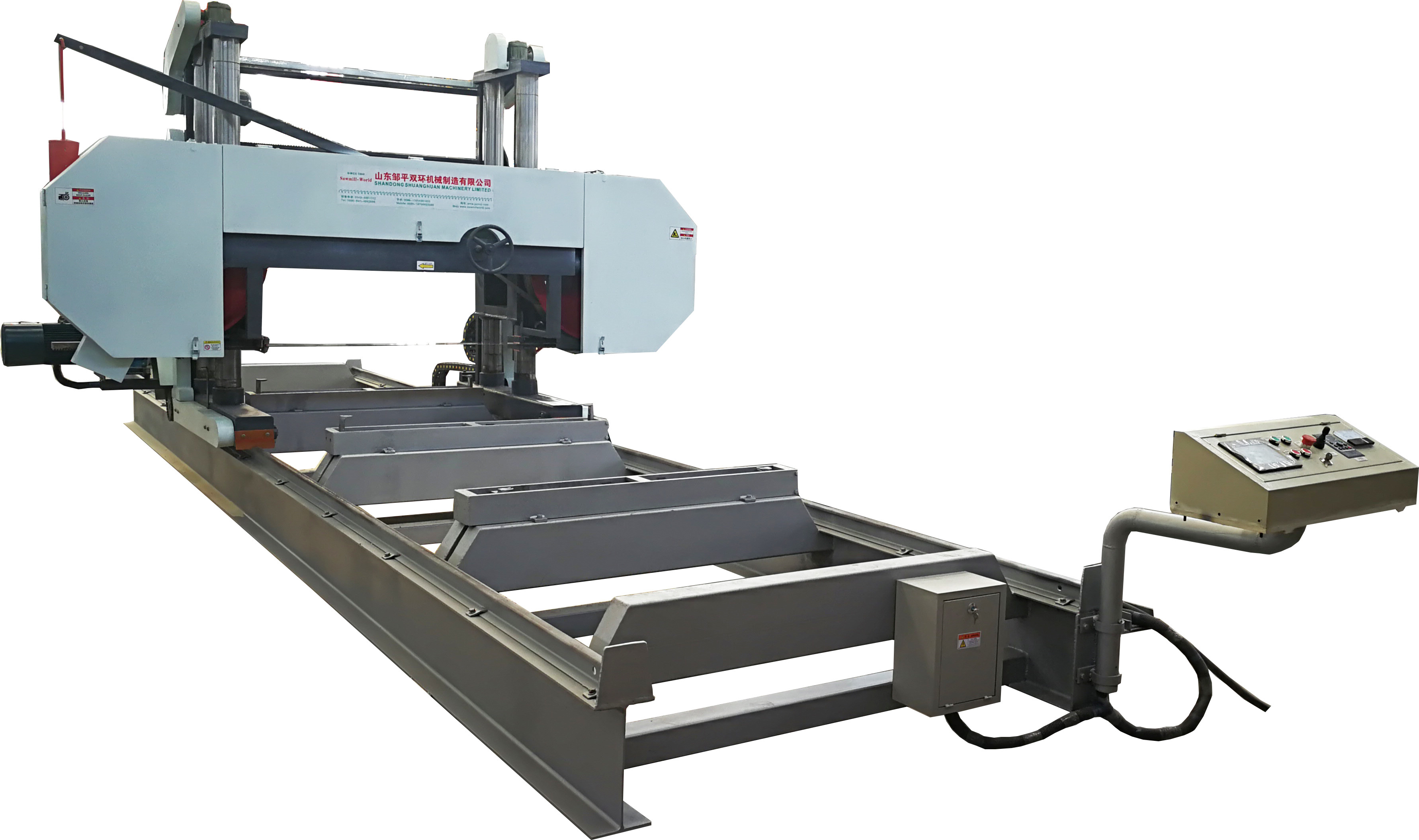 Elektrische u. Schrauben-Band-Sägeblatt-Spannung Stufenlos regelbare Geschwindigkeiten vorwärts und rückwärts Touch Screen sägende Stärkeeinstellung Schaltschrank und Sitze errichtet auf der Sägemühle Karten-Holzdatei mit 4 Gruppen bewegliche. |